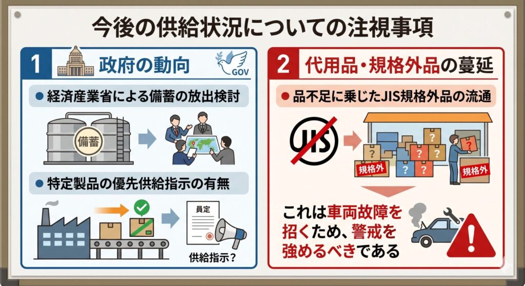 2. 代用品・規格外品の蔓延: 品不足に乗じたJIS規格外品の流通。これは車両故障を招くため、警戒を強めるべきである。