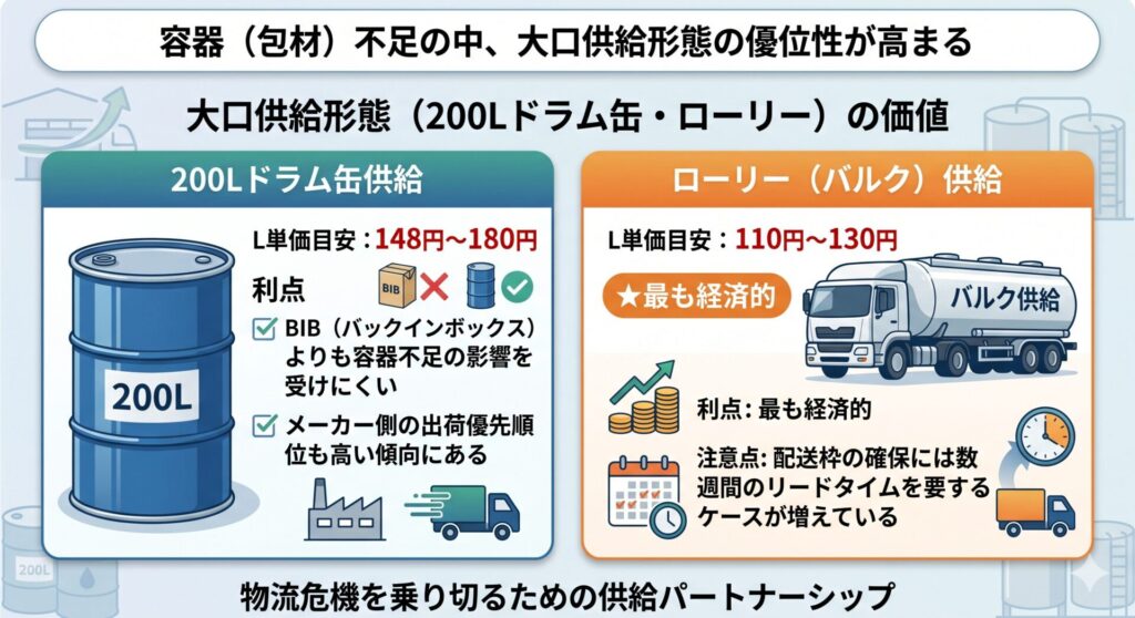 現在の局面では、従来の20Lバッグインボックス(BIB)に依存しない調達戦略が、リスク分散の鍵となる。