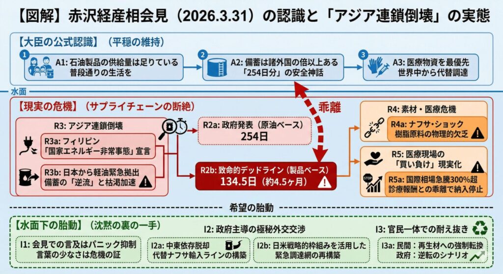 経産省は会見のわずか1週間前、3月24日に「当面1ヶ月分の国家備蓄石油の放出」を決定した(資源エネルギー庁発表)。本来、国家備蓄は物理的な供給途絶に対する最後の砦であり、これを放出するということは、通常ルートでの調達が極めて困難であることを政府自ら認めているに等しい。