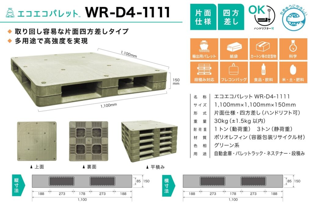 WR-D4-1111パレットは容器包装リサイクル材を使用した環境に優しい両面プラスチックパレットです。またこのクラスの強度のプラスチックパレットでは最安値で販売キャンペーン中です!ドラム缶・フレコン・紙袋の輸出ワンウェイ用に多数販売実績があります。またネステナーやラック等の保管用途でも使用実績がございます。ご要望に応じてシルク印刷対応も可能です。ベタ面の特性を活かして、ゲリラ豪雨・大雨対策として倉庫でスノコ利用として使用されるケースも増えております。