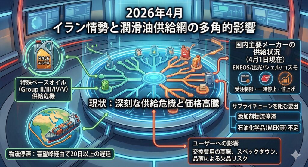 本記事では、2026年4月現在の最新エビデンスに基づき、イラン情勢が潤滑油市場に与えている多角的な影響と、主要メーカーのリアルタイムな供給状況を徹底解説します。