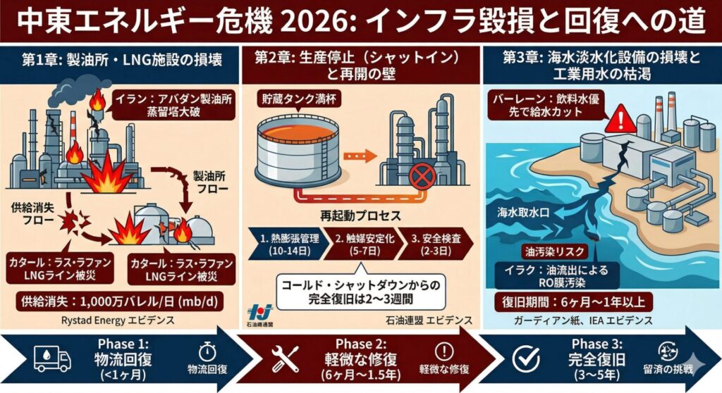 【2026年緊急予測】中東エネルギーインフラの崩壊と「失われる5年間」:製油所・淡水化設備の毀損から読み解く世界経済の臨界点