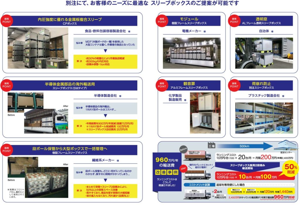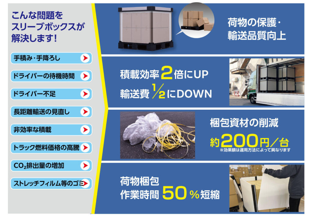 - 国内工場間・定期便輸送:スリーブボックスの活用