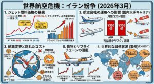 - 航空貨物の争奪戦: Bloomberg (2026/03) によると、Appleは中東空域を避けるため「北極ルート(アラスカ経由)」の貨物便を独占的にチャーター。これにより、競合他社が航空便を確保できない事態を招いています。