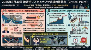 - 見直しのポイント: 喜望峰ルート迂回による最大20日のリードタイム延長は、棚卸資産の回転率を下げ、保管コストを増大させます。さらに、急騰する戦争保険料や、空コンテナ不足に伴う遅延損害のリスクを織り込んだ「真の着地原価」に基づいて、販売価格や調達計画を再設計してください。