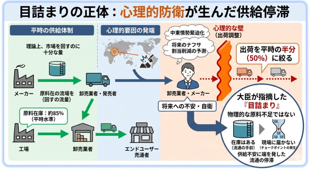 ではなぜ現場に届かないのか。エビデンスが示すのは、中間の卸売業者やメーカーによる「自衛的な出荷制限」である。中東情勢の緊迫化に伴い、将来のナフサ割当が削減されるという予測が先行した結果、流通側が「将来の在庫切れを恐れて、現在の出荷を平時の半分(50%)に絞る」という行動に出た。これが、大臣の言う「目詰まり」の正体である。