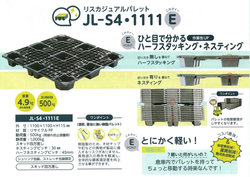 - 現場的エビデンス: 4.9kgなら、女性やシニアの作業者でも1人で10枚を楽にスタッキングできます。中古の重いパレットで腰を痛めるリスクや、破損による荷物事故の損害(隠れたコスト)を考えれば、新品のJL-S4・1111Eを導入する方がROI(投資対効果)は圧倒的に高くなります。