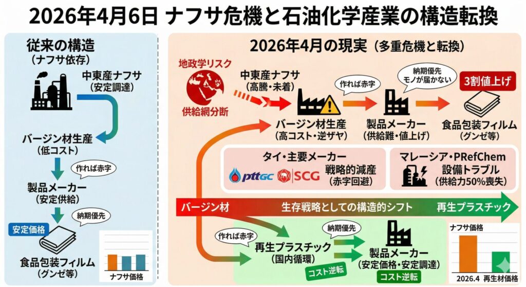 これらの動きは一時的なパニックではなく、石油化学産業における「脱ナフサ依存」の加速を意味しています。グンゼやクラレの値上げは、最終消費者がコストを負担するフェーズへの突入を示唆し、PRefChemやタイ勢の動向は、供給元としての東南アジアの不安定さを露呈させました。結果として、国内で完結する「再生プラスチック」へのシフトは、もはや必然の流れと言えるでしょう。