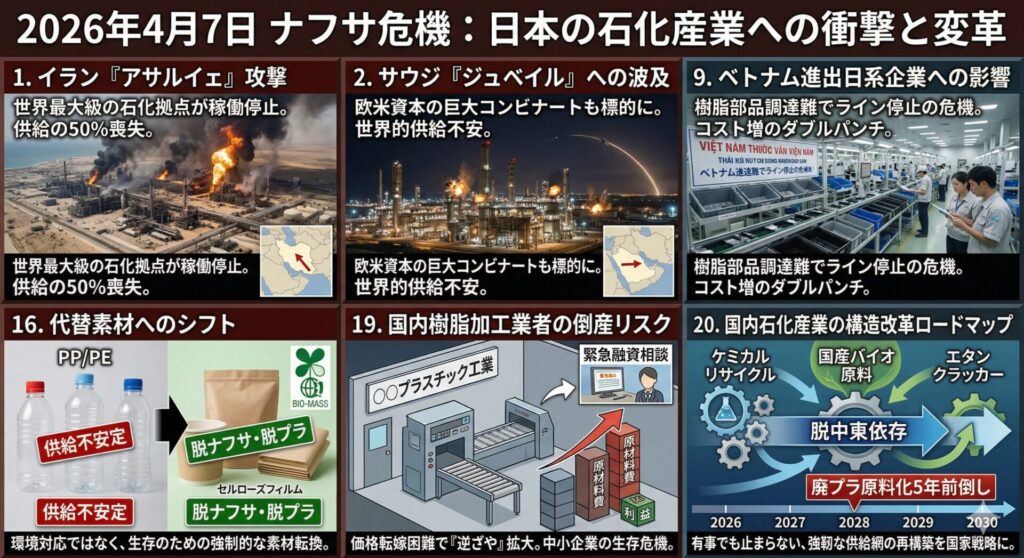 - リスク: 供給不足への懸念から、石油化学製品の供給網は「平時の流通」から「有事の奪い合い」へと変質しています。