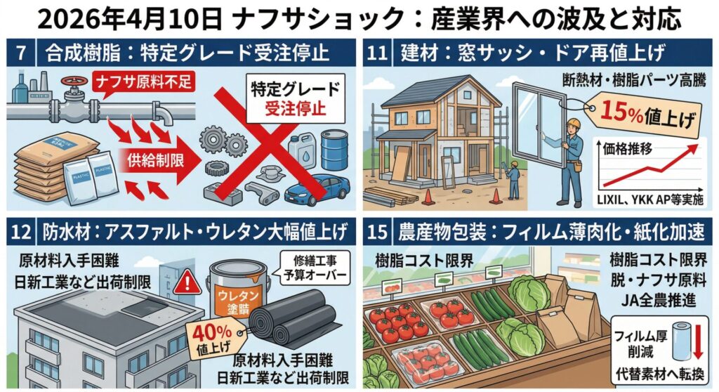 - エビデンス: 三井化学、東レ、住友化学各社の公式プレスリリースおよび取引先向け通達(2026年3月〜4月)。