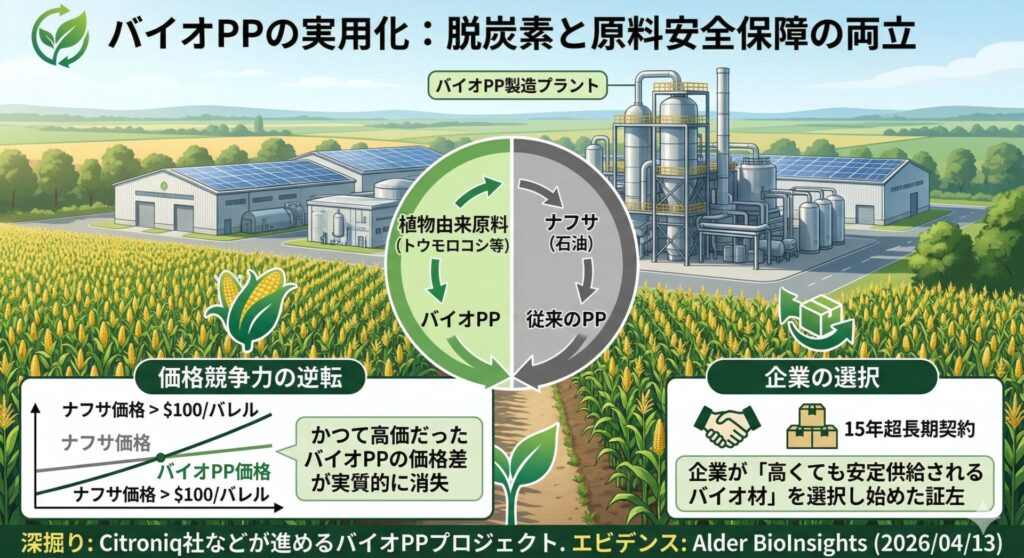 - 深掘り: Citroniq社などが進めるバイオPPプロジェクトは、トウモロコシなどの植物由来原料からPPを製造します。ナフサ価格が1バレルあたり$100を超える現状では、かつて高価だったバイオPPの価格差が実質的に消失しました。15年という超長期契約が成立したことは、企業が「高くても安定供給されるバイオ材」を選択し始めた証左です。