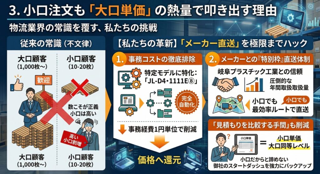 物流業界において、パレットの調達は「数こそが正義」とされてきました。1,000枚単位の顧客には頭を下げ、10枚、20枚の小口顧客には高い「小口割増」を課す。それがこれまでの業界の不文律です。しかし、私たちはその常識を真っ向から否定します。